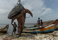 2019年 7/28(日) 15:49インドの漁港にジンベエザメの死骸漂着、クレーンで引きあげ