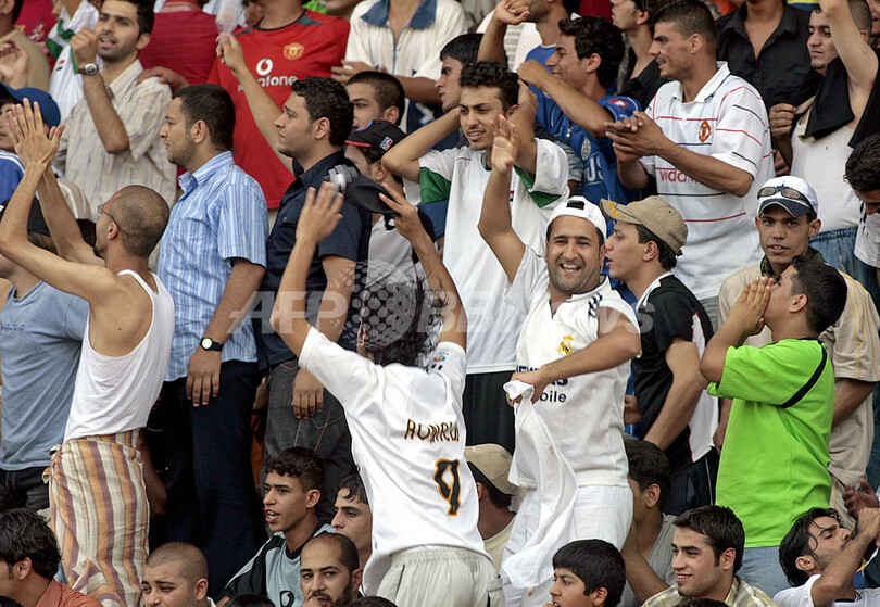 【バグダッド/イラク 24日 AFP】2万5000人以上のイラクのサッカー・ファンは23日、爆弾攻撃の危険も顧みずバグダッドの2チームの試合を観戦するためスタジアムへ訪れた。なお、試合は1対1の引分けに終わっている。写真は、al-Shaab stadiumで行われた準決勝のal-Kwat al-Jawiya(空軍)対al-Zawraa戦で、ゴールを決め歓声を上げるal-Zawraaのファン。(c)AFP/AHMAD AL-RUBAYE