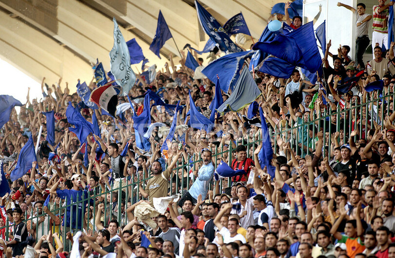 【バグダッド/イラク 24日 AFP】2万5000人以上のイラクのサッカー・ファンは23日、爆弾攻撃の危険も顧みずバグダッドの2チームの試合を観戦するためスタジアムへ訪れた。なお、試合は1対1の引分けに終わっている。写真は、al-Shaab stadiumで行われた準決勝のal-Kwat al-Jawiya(空軍)対al-Zawraa戦で、ゴールを決め歓声を上げるal-Zawraaのファン。(c)AFP/AHMAD AL-RUBAYE