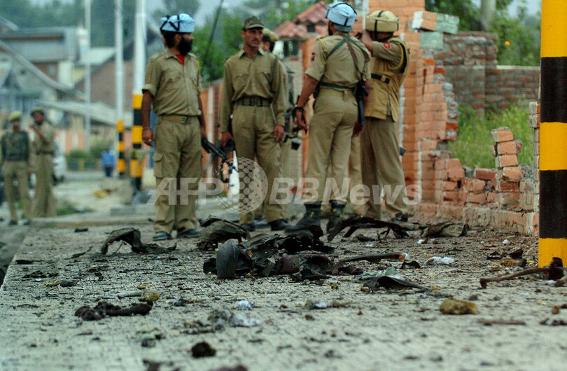 【スリナガル/インド 23日 AFP】マンモハン・シン(Manmohan Singh)首相の訪問を翌日に控えた23日、インド側カシミール(Kashmir)の首都スリナガル(Srinagar)で爆発物を満載したトラックが軍隊のバスに突っ込み、トラックを運転していた男が死亡、インド人の兵士20人が負傷した。シン首相は、24日の午前中に飛行機で到着後、同州軍司令部にヘリコプターで移動する予定になっている。シン首相は、カシミール滞在中に地元の政治家らと2日間にわたりテロ防止などについての会議を行う予定だが、穏健分離派や数政党では、既に同会議への参加拒否を表明している。写真は23日、自爆テロ攻撃を受けた軍のバス付近に立つ兵士。(c)AFP/Tauseef MUSTAF