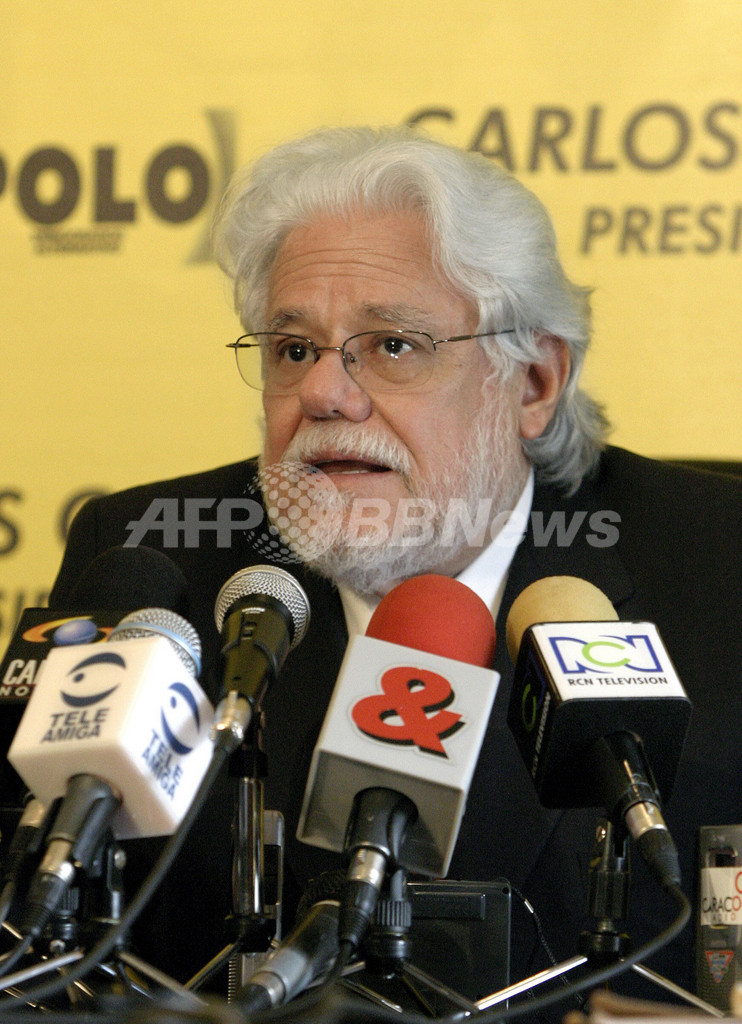 【ボゴタ/コロンビア 24日 AFP】前週発表された米世論調査会社ゾグビー・インターナショナルとマイアミ大学の共同調査結果によると、28日実施される大統領選挙では、現職のアルバロ・ウリベ(Alvaro Uribe)大統領が圧勝し、2期目を務めることが確実とみられる。ウリベ大統領の予想得票率は67%で、今月行われた他の世論調査より11%高かった。この調査は10~14日に有権者830人を対象に行われたもので、ウリベ大統領は、支持率15%で2位につけているカルロス・ガビリア(Carlos Gaviria)候補を大きくリードしている。写真は23日、ボゴタ(Bogota)で記者会見に臨む左派新民主党ポロ(Alternative Democratic Polo Party)のガビリア候補。(c)AFP/Alejandra VEGA