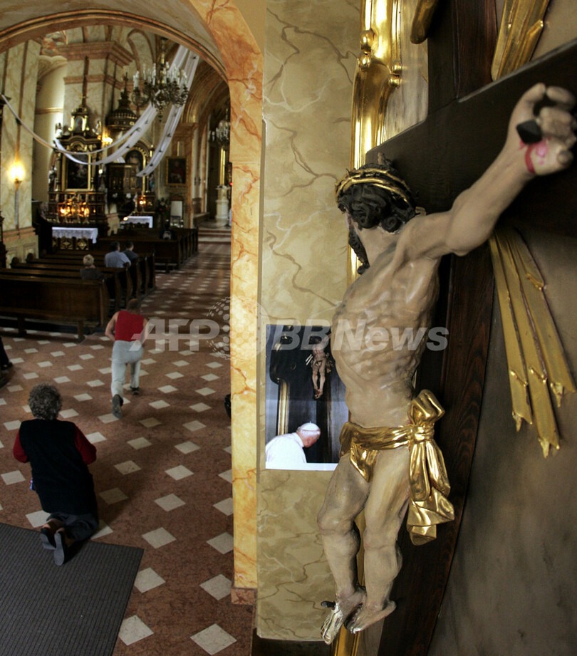【ワドビッツェ/ポーランド 24日 AFP】ローマ法王ベネディクト16世(Pope Benedict XVI)は25日、前法王の故ヨハネ・パウロ2世(John Paul II)の祖国であるポーランドを訪れ、郷里のワドビッツェ(Wadowice)を訪問する予定。写真はワドビッツェで23日、ヨハネ・パウロ2世が洗礼を受けた「Basilica of the Presentation of Virgin Mary」。イエス・キリストの十字架像の横に、ヨハネ・パウロ2世の写真が飾られている。(c)AFP/JOE KLAMAR