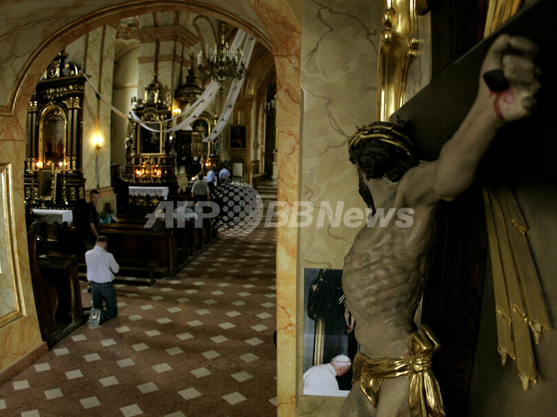 【ワドビッツェ/ポーランド 24日 AFP】ローマ法王ベネディクト16世(Pope Benedict XVI)は25日、前法王の故ヨハネ・パウロ2世(John Paul II)の祖国であるポーランドを訪れ、郷里のワドビッツェ(Wadowice)を訪問する予定。写真はワドビッツェで23日、ヨハネ・パウロ2世が洗礼を受けた「Basilica of the Presentation of Virgin Mary」。イエス・キリストの十字架像の横に、ヨハネ・パウロ2世の写真が飾られている。(c)AFP/JOE KLAMAR