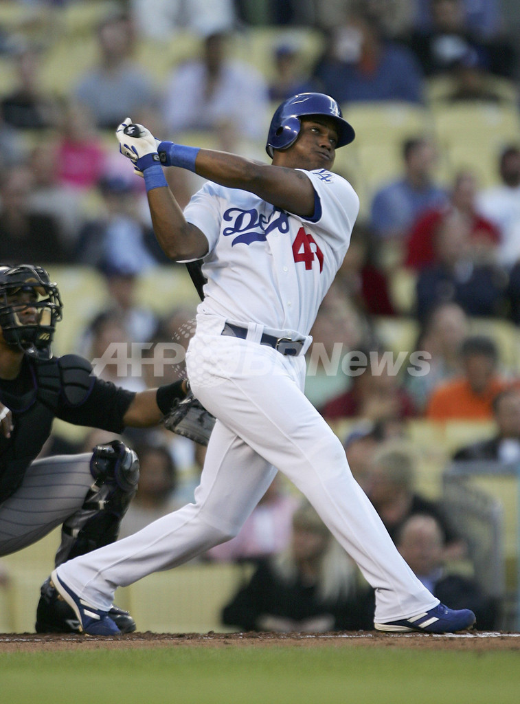【カリフォルニア/米国 23日 AFP】MLB、コロラド・ロッキーズ(Colorado Rockies)vsロサンゼルス・ドジャース(Los Angeles Dodgers)。ドジャースのケニー・ロフトン(Kenny Lofton)は、この試合5打数3安打2打点の活躍でチームの勝利に貢献。試合は8-1でドジャースがロッキーズを降し、連勝を6に伸ばした。(c)AFP/Getty Images Robert Laberge