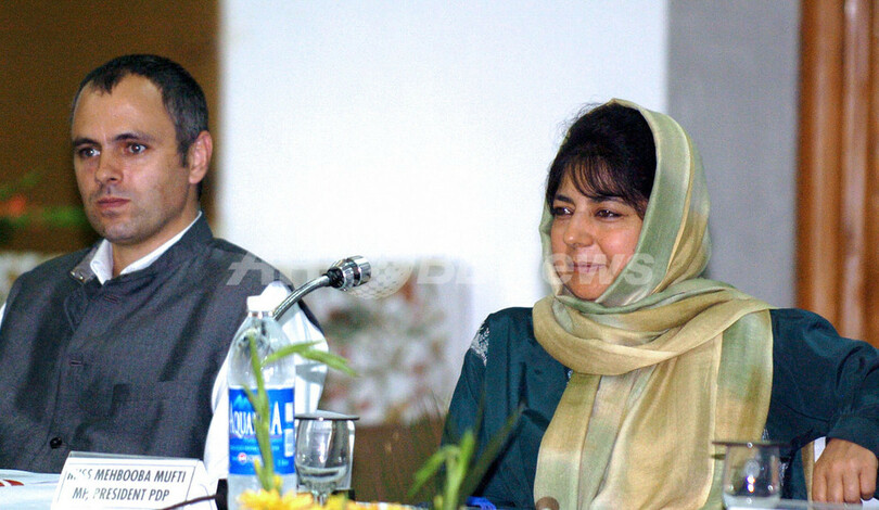 【スリナガル/インド 24日 AFP】カシミール(Kashmir)州の州都スリナガル(Srinagar)で24日、マンモハン・シン(Manmohan Singh)首相は、カシミール州の野党第一党、ジャム・カシミール民族協議会(National Conference)のOmar Abdullah総裁と人民民主党(PDP)のMehbooba Mufty総裁を交えた円卓会議に出席した。シン首相の国民会議派(Congress Party)は3年半にわたり同州を統治してきた。シン首相の到着に合わせてゼネストやボイコットが行われ、暴動も発生したものの、首相は2日間の和平会談を「重要な第一歩」であると言明した。写真は、円卓会議に出席したAbdullah総裁(左)とMufty総裁。(c)AFP/Tauseef MUSTAFA