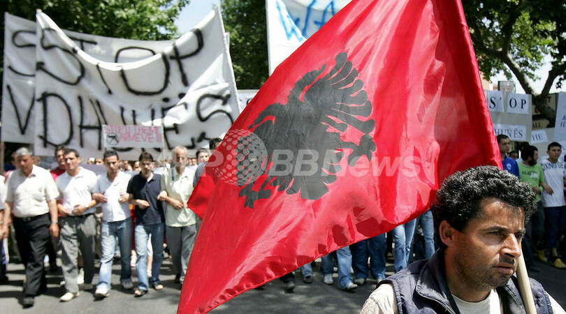【スコピエ/マケドニア 25日 AFP】マケドニアの首都スコピエ(Skopje)で24日、19日夜に満員のインターネットカフェで若者3人が射殺された事件に抗議し、暴力反対を訴えるデモが行われた。マケドニアは2001年、アルバニア系住民の反政府勢力との衝突を機に7か月間にわたって紛争状態に陥った。憲法改正でアルバニア系住民の権利向上が認められたことにより、紛争は終結した。人口200万のうちアルバニア系住民は4分の1を占める。写真は同日、「暴力を止めろ」「銃器反対」などと書かれた横断幕を持ち行進するデモ参加者たち。(c)AFP/IGOR BANSKOLIEV