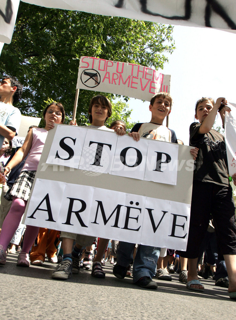 【スコピエ/マケドニア 25日 AFP】マケドニアの首都スコピエ(Skopje)で24日、19日夜に満員のインターネットカフェで若者3人が射殺された事件に抗議し、暴力反対を訴えるデモが行われた。マケドニアは2001年、アルバニア系住民の反政府勢力との衝突を機に7か月間にわたって紛争状態に陥った。憲法改正でアルバニア系住民の権利向上が認められたことにより、紛争は終結した。人口200万のうちアルバニア系住民は4分の1を占める。写真は同日、「暴力を止めろ」「銃器反対」などと書かれた横断幕を持ち行進するデモ参加者たち。(c)AFP/IGOR BANSKOLIEV