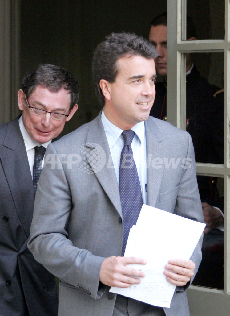 【パリ/フランス 25日 AFP】ドミニク・ドビルパン(Dominique de Villepin)首相とジェラール・ラルシェ(Gerard Larcher)雇用・労働・若年者就職担当相はパリで24日、欧州の航空防衛宇宙大手EADSのアルノー・ラガルデール(Arnaud Lagardere)共同会長およびノエル・フォルジャール(Noel Forgeard)共同最高経営責任者と会談した。写真は会談を終え、会場の首相府(Matignon hotel)を後にするラガルデール氏(右)とフォルジャール氏。(c)AFP/JACK GUEZ