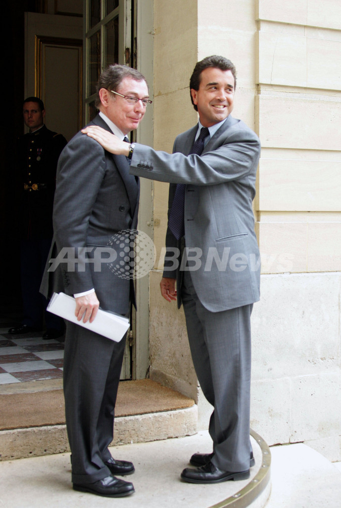 【パリ/フランス 25日 AFP】ドミニク・ドビルパン(Dominique de Villepin)首相とジェラール・ラルシェ(Gerard Larcher)雇用・労働・若年者就職担当相はパリで24日、欧州の航空防衛宇宙大手EADSのアルノー・ラガルデール(Arnaud Lagardere)共同会長およびノエル・フォルジャール(Noel Forgeard)共同最高経営責任者と会談した。写真は会談を終え、会場の首相府(Matignon hotel)を後にするラガルデール氏(右)とフォルジャール氏。(c)AFP/JACK GUEZ