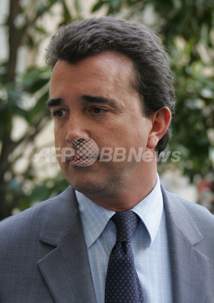 【パリ/フランス 25日 AFP】ドミニク・ドビルパン(Dominique de Villepin)首相とジェラール・ラルシェ(Gerard Larcher)雇用・労働・若年者就職担当相はパリで24日、欧州の航空防衛宇宙大手EADSのアルノー・ラガルデール(Arnaud Lagardere)共同会長およびノエル・フォルジャール(Noel Forgeard)共同最高経営責任者と会談した。写真は会談を終え、会場の首相府(Matignon hotel)を後にするラガルデール氏(右)とフォルジャール氏。(c)AFP/JACK GUEZ