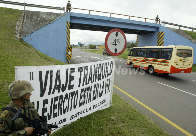 【Tulua/コロンビア 25日 AFP】前週発表された米世論調査会社ゾグビー・インターナショナル(Zogby International)とマイアミ大学の共同調査によると、28日実施されるコロンビア大統領選挙では、現職のアルバロ・ウリベ(Alvaro Uribe)大統領が圧勝し、2期目を務めることが確実とみられる。ウリベ大統領の予想得票率は67%で、今月行われた他の世論調査を11%ポイント上回った。この調査は10~14日に有権者830人を対象に行われたもので、ウリベ大統領は、支持率15%で2位につけているカルロス・ガビリア(Carlos Gaviria)候補を大きくリードしている。写真はバラ・デル・カウカ(Valle del Cauca)州のカリ(Cali)近郊で24日、来たる選挙に備えて幹線道路を警備する兵士。(c)AFP/Carlos Julio MARTINEZ