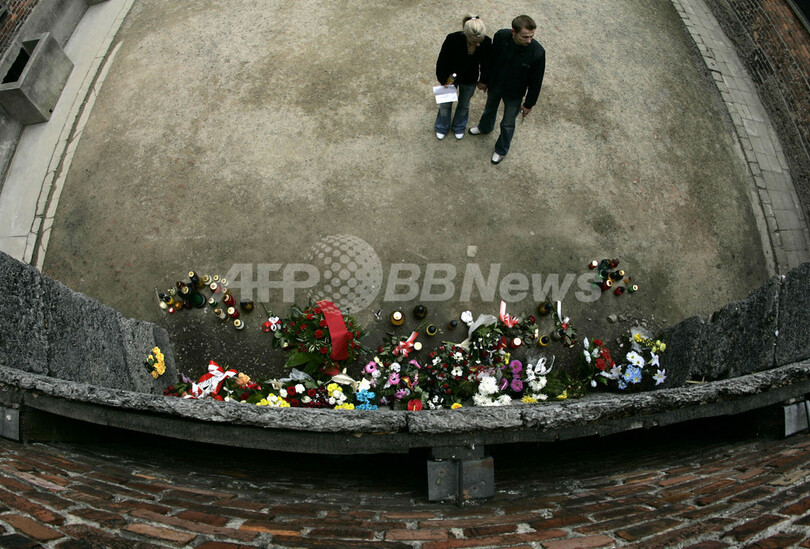 【オシフィエンチム/ポーランド 25日 AFP】ローマ法王ベネディクト16世(Pope Benedict XVI)のポーランド訪問を控えた24日、ナチスのアウシュビッツ(Auschwitz)強制収容所跡を訪れた人々が花やロウソクを手向けた。法王はアウシュビッツ、ビルケナウ(Birkenau)の強制収容所跡を訪れる予定となっている。写真は同日、アウシュビッツ強制収容所内の処刑場で花とロウソクを手向ける訪問者。(c)AFP/JOE KLAMAR