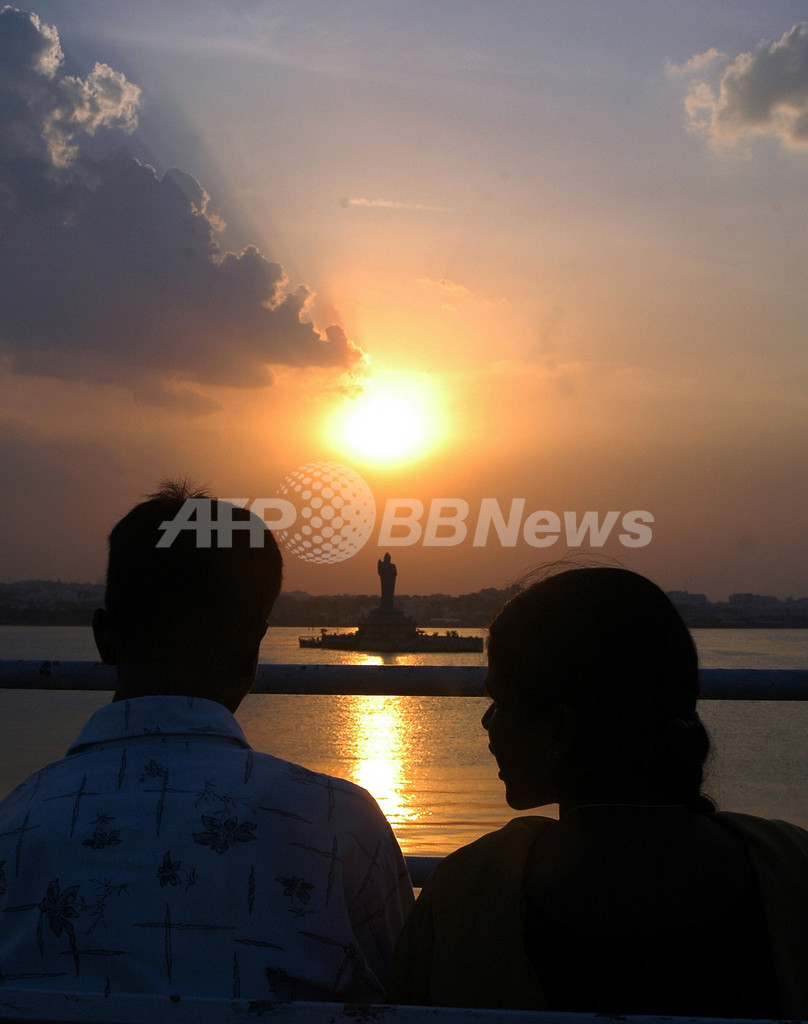【ハイデラバード/インド 25日 AFP】南部アンドラプラデシュ(Andhra Pradesh)州では、雨の神がほほ笑みをもたらしたかのような降雨に伴い、一時的に気温が33度を下回った。気象関係者によると、農業従事者数億人の生活に不可欠な夏季モンスーン期の訪れは予報通りとなる見通し。写真は24日、そよ風の吹くハイデラバード(Hyderabad)のHussainsagar湖畔で涼をとりながら、沈む夕日を眺めるカップル。(c)AFP/NOAH SEELAM