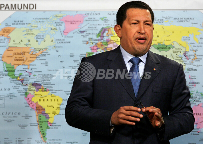 【カラカス/ベネズエラ 25日 AFP】ベネズエラのウゴ・チャベス(Hugo Chavez)大統領は23日夜、アルゼンチン、ブラジル、パラグアイ、ウルグアイが参加する南米の共同市場、メルコスル(MERCOSUR)へのベネズエラの「加盟手続き」が認められたとブエノスアイレス(Buenos Aires)で発表した。写真は24日、カラカス(Caracas)のミラフローレス(Miraflores)大統領宮殿で記者会見するチャベス大統領。(c)AFP/Juan BARRETO