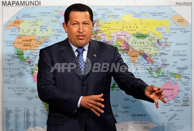 【カラカス/ベネズエラ 25日 AFP】ベネズエラのウゴ・チャベス(Hugo Chavez)大統領は23日夜、アルゼンチン、ブラジル、パラグアイ、ウルグアイが参加する南米の共同市場、メルコスル(MERCOSUR)へのベネズエラの「加盟手続き」が認められたとブエノスアイレス(Buenos Aires)で発表した。写真は24日、カラカス(Caracas)のミラフローレス(Miraflores)大統領宮殿で記者会見するチャベス大統領。(c)AFP/Juan BARRETO