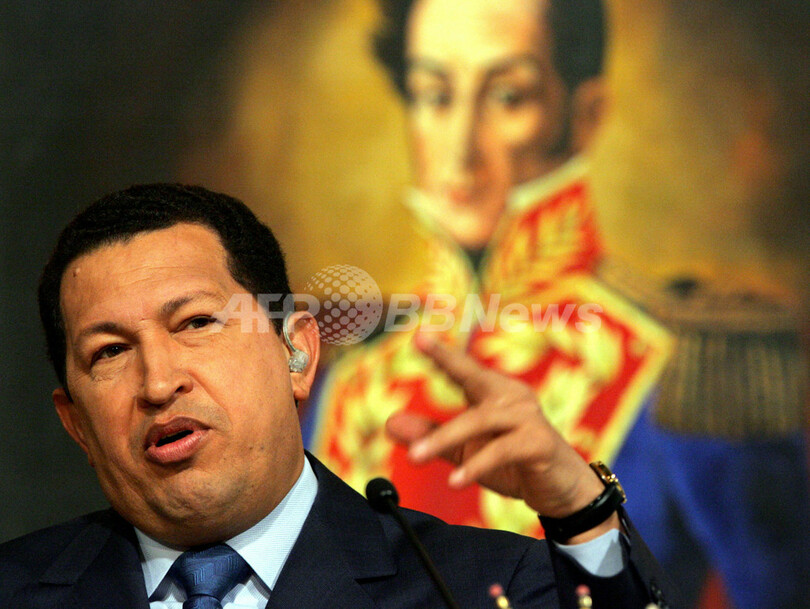 【カラカス/ベネズエラ 25日 AFP】ベネズエラのウゴ・チャベス(Hugo Chavez)大統領は23日夜、アルゼンチン、ブラジル、パラグアイ、ウルグアイが参加する南米の共同市場、メルコスル(MERCOSUR)へのベネズエラの「加盟手続き」が認められたとブエノスアイレス(Buenos Aires)で発表した。写真は24日、カラカス(Caracas)のミラフローレス(Miraflores)大統領宮殿で記者会見するチャベス大統領。(c)AFP/Juan BARRETO