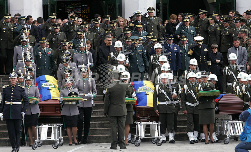 ニュース 政治・経済 誤射で死亡した警官の葬儀行われる - コロンビア 2006年5月25日 9:25 発信地:コロンビア [ 中南米 コロンビア ] このニュースをシェア ‹ › ❮ 4/4 ❯ 写真は葬儀の間、棺の横で待機する儀杖兵。(c)AFP/Rodrigo ARANGUA 画像作成中 ! 【ボゴタ/コロンビア 25日 AFP】コロンビア南部のハムンディ(Jamundi)で、麻薬取締の秘密捜査に従事していた少なくとも10人の警察官が、誤って兵士に射殺されたとカミロ・オスピナ(Camilo Ospina)国防相が発表した。ボゴタ(Bogota)では24日、射殺された10人の警官のうち3人の葬儀が行われた。写真は葬儀の間、棺の横で待機する儀杖兵。(c)AFP/Rodrigo ARANGUA 政治・経済 一覧へ> メディア・報道関係・法人の方向け 写真・動画 購入のお問合せ>