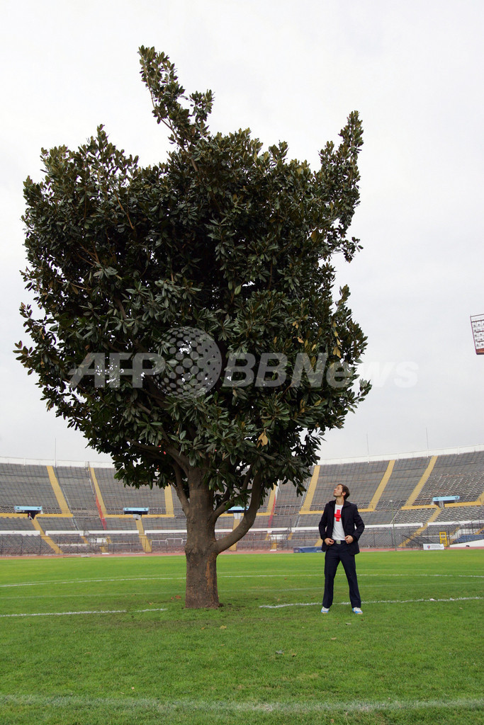 【サンティアゴ/チリ 28日 AFP】24日、「アーティスティック・アーバン・インストレーション(Artistic Urban Installation)」と呼ばれるプロジェクトの一環として、チリのプラスチック・アーティスト、セバスチャン・エラスリス(Sebastian Errazuriz)により10メートルもあるモクレンの木が、サンティアゴの国立競技場のピッチに植えられた。同プロジェクトは28日まで開催される。写真は、国立競技場のピッチに植えられたモクレンの木の横でポーズをとるチリのプラスチック・アーティスト、セバスチャン・エラスリス。(c)AFP/MARTIN BERNETTI