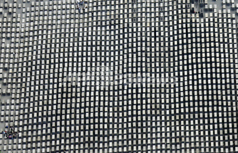 【ベルリン/ドイツ 28日 AFP】米国の建築家ピーター・アイゼンマン(Peter Eisenmann)によりデザインされた、殺害されたヨーロッパのユダヤ人ための記念碑「ホロコースト記念碑(Memorial to the Murdered Jews of Europe)」が今月10日に開設1年目を迎えた。ベルリンにある同記念碑は、2005年の5月に開設されて以来300万人の来場者が訪れた。写真は、今月23日にベルリン上空から「ホロコースト記念碑」を撮影したもの。(c)AFP/JOHANNES EISELE