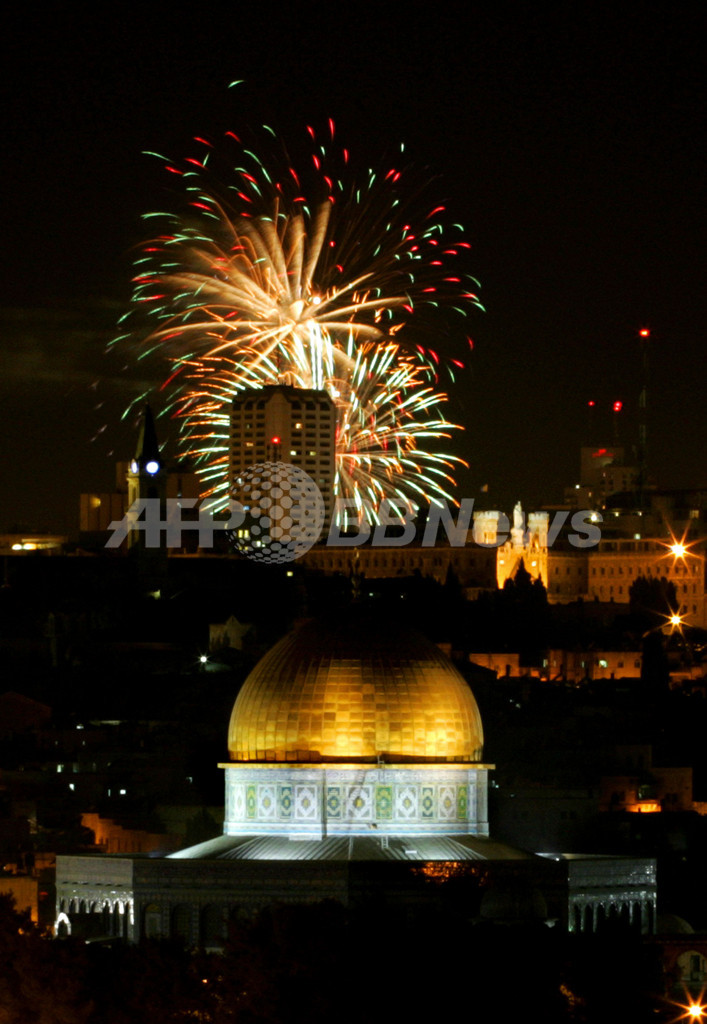 【エルサレム/イスラエル 26日 AFP】24日、イスラエルの首都エルサレム(Jerusalem)が1967年の第3次中東戦争(6日間戦争)で統一され今年で39周年となった事を祝う公式祝典の前夜に、エルサレム旧市街のアル・アクサモスク(Al-Aqsa mosque)で祝賀花火が打ちあがった。エルサレム旧市街では、1967年6月7日に起きた戦争で、イスラエルがヨルダンの支配下にあった東エルサレム区域を制圧してから今年で39周年を迎える。写真は、エルサレム旧市街にあるアル・アクサ・モスクで、ロック・モスク(Rock Mosque)の黄金のドーム(Golden Dome)上空を照らし出す花火。(c)AFP/GALI TIBBON