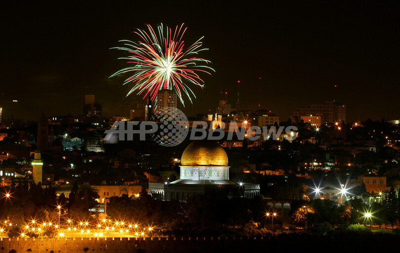 【エルサレム/イスラエル 26日 AFP】24日、イスラエルの首都エルサレム(Jerusalem)が1967年の第3次中東戦争(6日間戦争)で統一され今年で39周年となった事を祝う公式祝典の前夜に、エルサレム旧市街のアル・アクサモスク(Al-Aqsa mosque)で祝賀花火が打ちあがった。エルサレム旧市街では、1967年6月7日に起きた戦争で、イスラエルがヨルダンの支配下にあった東エルサレム区域を制圧してから今年で39周年を迎える。写真は、エルサレム旧市街にあるアル・アクサ・モスクで、ロック・モスク(Rock Mosque)の黄金のドーム(Golden Dome)上空を照らし出す花火。(c)AFP/GALI TIBBON