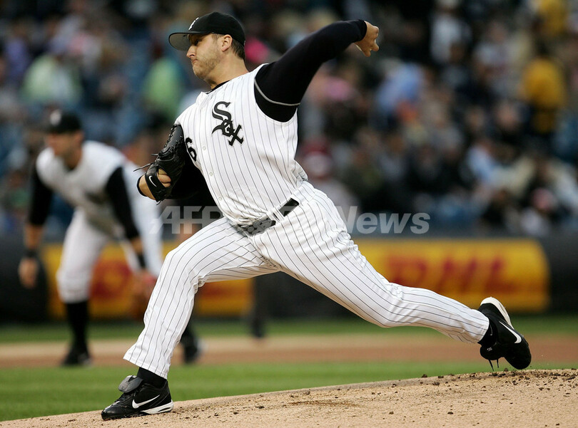 【イリノイ/米国 24日 AFP】MLB、オークランド・アスレチックス(Oakland Athletics)vsシカゴ・ホワイトソックス(Chicago White Sox)。ホワイトソックスの先発マーク・バーリー(Mark Buehrle)は、7回を被安打6失点1に抑える好投をみせ今季6勝目を挙げた。試合は3-2でホワイトソックスが勝利を収め、3連勝を飾った。(c)AFP/Getty Images Jonathan Daniel