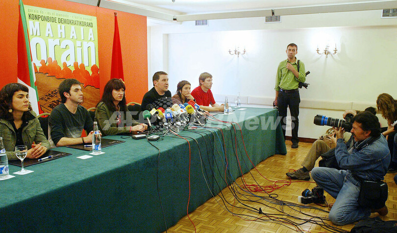 ニュース 戦争・紛争 バスク地方の非合法政党、和平プロセスに向けて記者会見 - スペイン 2006年5月25日 2:13 発信地:スペイン [ ヨーロッパ スペイン ] このニュースをシェア ‹ › ❮ 3/7 ❯ 写真は24日、記者会見に臨んだ同党の代表者ら。(c)AFP/RAFA RIVAS 画像作成中 ! 【パンプロナ/スペイン 24日 AFP】バスク(Basque)の非合法政党バタスナ(Batasuna)の代表らが24日、同国北部のパンプロナ(Pamplona)市で記者会見を開いた。代表らは記者団に、和平プロセスの交渉のための声明を発表した。背後のポスターには「時が来た、今こそ民主的な解決を」というスローガンが書かれている。写真は24日、記者会見に臨んだ同党の代表者ら。(c)AFP/RAFA RIVAS 戦争・紛争 一覧へ> メディア・報道関係・法人の方向け 写真・動画 購入のお問合せ>
