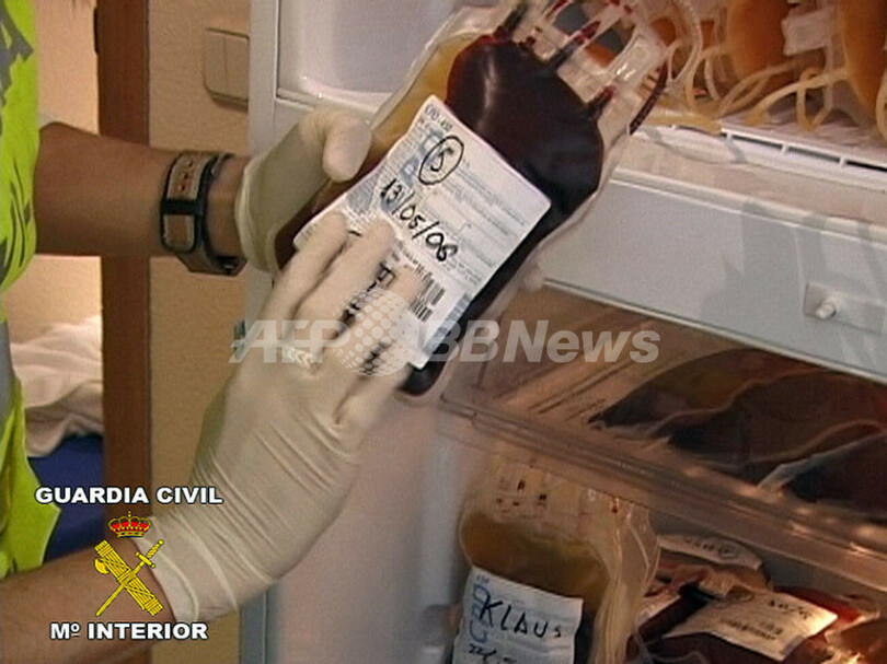 【マドリード/スペイン 25日 AFP】24日、スペインのプロ自転車レースチーム、リバティー・セグロス(Liberty Seguros)が所有するサラゴサ(Zaragoza)とマドリードの施設を捜査中のスペイン治安警備総局(Guardia Civil)は大量の薬物(ドーピング禁止薬)を押収した。同日、マノロ・サイス(Manolo Saiz)監督ほか5人を逮捕している。写真は、マドリードのリバティー・セグロスの施設で、保存された血液の袋を手に取る捜査官。(c)AFP
