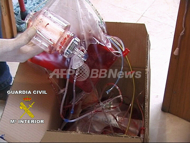 【マドリード/スペイン 25日 AFP】24日、スペインのプロ自転車レースチーム、リバティー・セグロス(Liberty Seguros)が所有するサラゴサ(Zaragoza)とマドリードの施設を捜査中のスペイン治安警備総局(Guardia Civil)は大量の薬物(ドーピング禁止薬)を押収した。同日、マノロ・サイス(Manolo Saiz)監督ほか5人を逮捕している。写真は、マドリードのリバティー・セグロスの施設で、保存された血液の袋を手に取る捜査官。(c)AFP