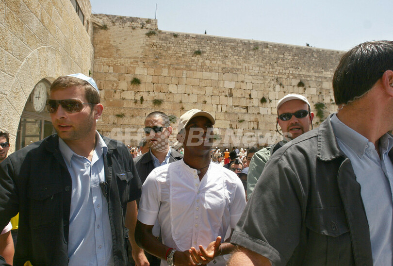 【エルサレム/イスラエル 26日 AFP】25日、サッカーチーム、F.C.バルセロナ(F.C. Barcelona)に所属するカメルーンの国際的スター、サミュエル・エトー(Samuel Eto)選手が、エルサレム(Jerusalem)のキリスト教徒地区を訪問。シモン・ペレス平和センター(Peres Center for Peace)の招待を受けて2日間の日程で滞在する。写真は、警備陣に囲まれながらエルサレム旧市街のキリスト教徒地区を訪れ、携帯電話で写真撮影するエトー選手。(c)AFP/OREL COHEN