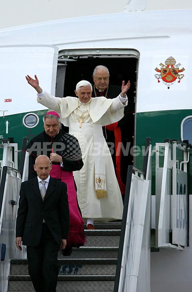 【ワルシャワ/ポーランド 26日 AFP】ローマ法王ベネディクト16世(Pope Benedict XVI)は25日、ワルシャワ(Warsaw)に到着した。ベネディクト16世は、4日間の訪問中に前法王ヨハネ・パウロII世(John Paul II)の生涯と法王の職にゆかりの深かった場所を訪問する。また旧ナチス(Nazi)の死の収容所、アウシュビッツ・ビルケナウ強制収容所(Auschwitz-Birkenau)も訪れる予定。写真は、ワルシャワのオケンチェ(Okecie)国際空港で、飛行機のタラップに立ち、群集を祝福するローマ法王。(c)AFP/JANEK SKARZYNSKI