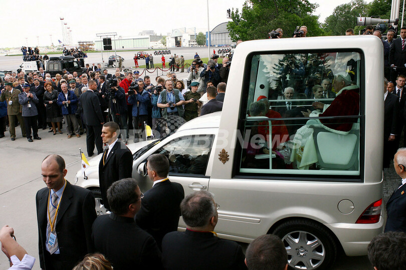 【ワルシャワ/ポーランド 26日 AFP】ローマ法王ベネディクト16世(Pope Benedict XVI)は25日、ワルシャワ(Warsaw)に到着した。ベネディクト16世は、4日間の訪問中に前法王ヨハネ・パウロII世(John Paul II)の生涯と法王の職にゆかりの深かった場所を訪問する。また旧ナチス(Nazi)の死の収容所、アウシュビッツ・ビルケナウ強制収容所(Auschwitz-Birkenau)も訪れる予定。写真は、ワルシャワのオケンチェ(Okecie)国際空港で、飛行機のタラップに立ち、群集を祝福するローマ法王。(c)AFP/JANEK SKARZYNSKI
