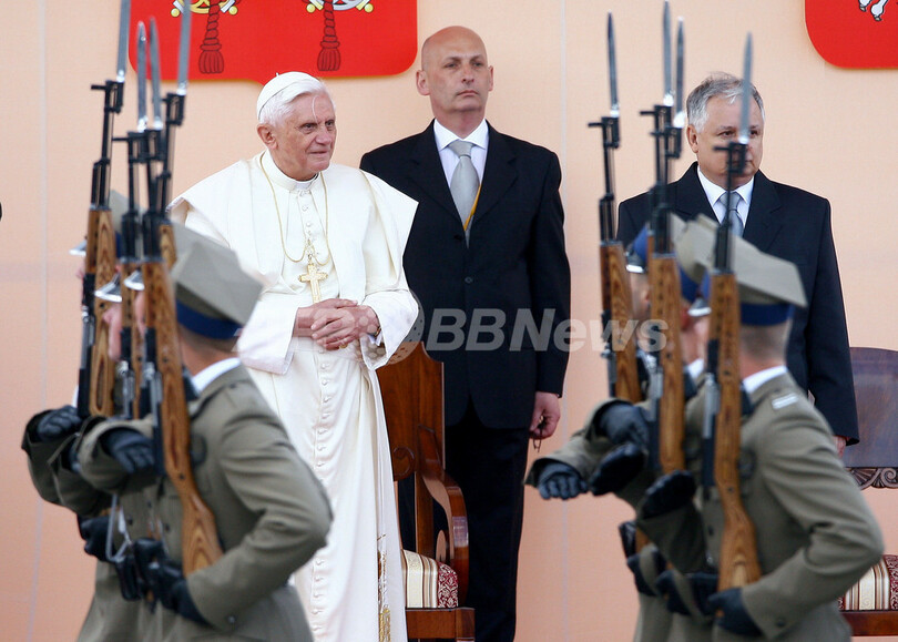 【ワルシャワ/ポーランド 26日 AFP】ローマ法王ベネディクト16世(Pope Benedict XVI)は25日、ワルシャワ(Warsaw)に到着した。ベネディクト16世は、4日間の訪問中に前法王ヨハネ・パウロII世(John Paul II)の生涯と法王の職にゆかりの深かった場所を訪問する。また旧ナチス(Nazi)の死の収容所、アウシュビッツ・ビルケナウ強制収容所(Auschwitz-Birkenau)も訪れる予定。写真は、ワルシャワのオケンチェ(Okecie)国際空港で、飛行機のタラップに立ち、群集を祝福するローマ法王。(c)AFP/JANEK SKARZYNSKI