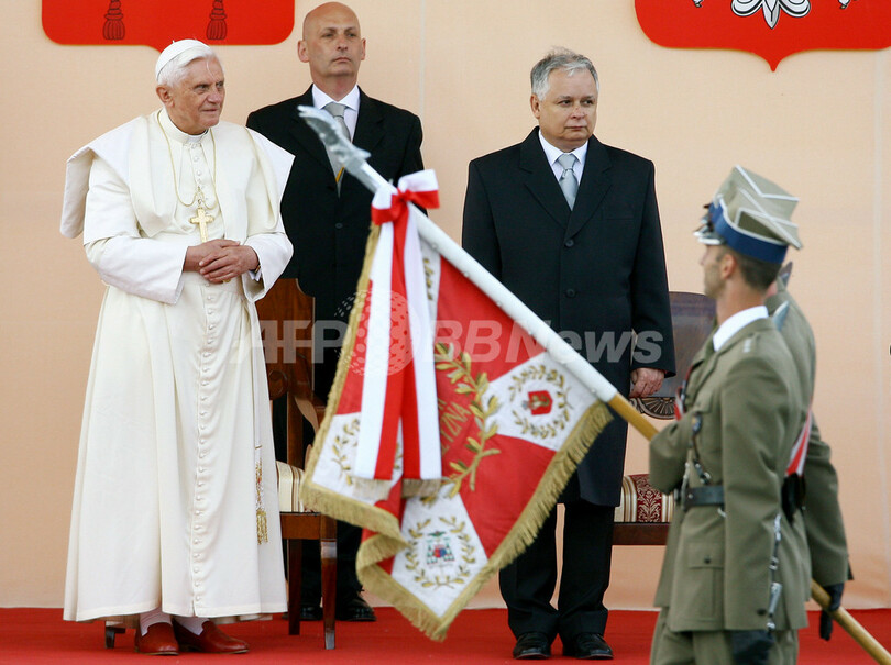 【ワルシャワ/ポーランド 26日 AFP】ローマ法王ベネディクト16世(Pope Benedict XVI)は25日、ワルシャワ(Warsaw)に到着した。ベネディクト16世は、4日間の訪問中に前法王ヨハネ・パウロII世(John Paul II)の生涯と法王の職にゆかりの深かった場所を訪問する。また旧ナチス(Nazi)の死の収容所、アウシュビッツ・ビルケナウ強制収容所(Auschwitz-Birkenau)も訪れる予定。写真は、ワルシャワのオケンチェ(Okecie)国際空港で、飛行機のタラップに立ち、群集を祝福するローマ法王。(c)AFP/JANEK SKARZYNSKI