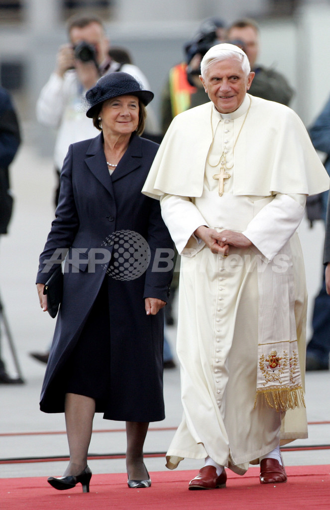 【ワルシャワ/ポーランド 26日 AFP】ローマ法王ベネディクト16世(Pope Benedict XVI)は25日、ワルシャワ(Warsaw)に到着した。ベネディクト16世は、4日間の訪問中に前法王ヨハネ・パウロII世(John Paul II)の生涯と法王の職にゆかりの深かった場所を訪問する。また旧ナチス(Nazi)の死の収容所、アウシュビッツ・ビルケナウ強制収容所(Auschwitz-Birkenau)も訪れる予定。写真は、ワルシャワのオケンチェ(Okecie)国際空港で、飛行機のタラップに立ち、群集を祝福するローマ法王。(c)AFP/JANEK SKARZYNSKI