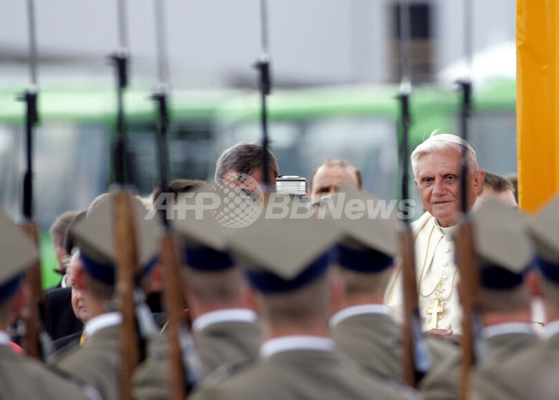 【ワルシャワ/ポーランド 26日 AFP】ローマ法王ベネディクト16世(Pope Benedict XVI)は25日、ワルシャワ(Warsaw)に到着した。ベネディクト16世は、4日間の訪問中に前法王ヨハネ・パウロII世(John Paul II)の生涯と法王の職にゆかりの深かった場所を訪問する。また旧ナチス(Nazi)の死の収容所、アウシュビッツ・ビルケナウ強制収容所(Auschwitz-Birkenau)も訪れる予定。写真は、ワルシャワのオケンチェ(Okecie)国際空港で、飛行機のタラップに立ち、群集を祝福するローマ法王。(c)AFP/JANEK SKARZYNSKI