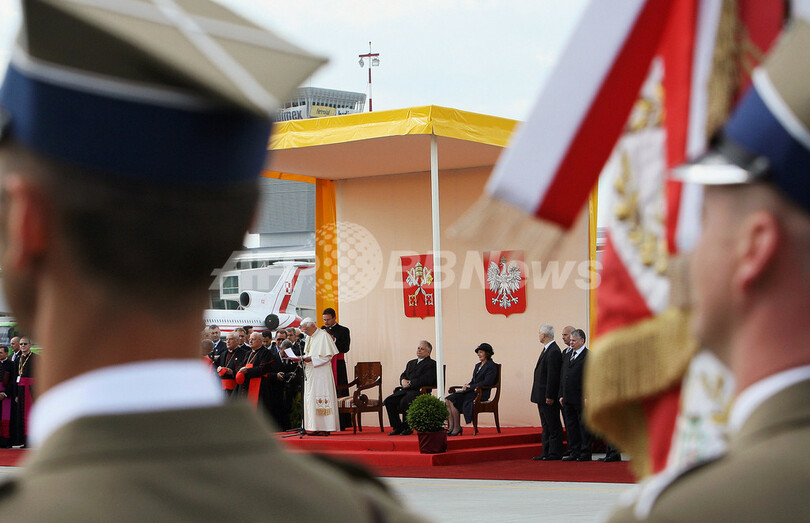 【ワルシャワ/ポーランド 26日 AFP】ローマ法王ベネディクト16世(Pope Benedict XVI)は25日、ワルシャワ(Warsaw)に到着した。ベネディクト16世は、4日間の訪問中に前法王ヨハネ・パウロII世(John Paul II)の生涯と法王の職にゆかりの深かった場所を訪問する。また旧ナチス(Nazi)の死の収容所、アウシュビッツ・ビルケナウ強制収容所(Auschwitz-Birkenau)も訪れる予定。写真は、ワルシャワのオケンチェ(Okecie)国際空港で、飛行機のタラップに立ち、群集を祝福するローマ法王。(c)AFP/JANEK SKARZYNSKI