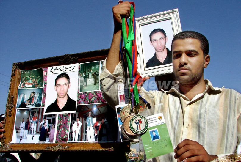 【バグダッド/イラク 26日 AFP】バグダッド西方のファルージャ(Fallujah)とラマディ(Ramadi)の間で、前週、イラクのテコンドー・チームの15人のメンバーが誘拐された。2003年3月のイラク戦争開戦後、イラクでは数千人以上が誘拐されており、スンニ派の町サマラ(Samarra)でシーア派聖廟が攻撃されてからは、誘拐後に殺害されるケースが急増した。写真は25日、バグダッドの貧困地区サドルシティ(Sadr City)で行われたテコンドーのRasoul Salah選手誘拐に対する抗議デモで、Salahさんがイラクのために勝ち取ったメダルを掲げる親族。(c)AFP/WISSAM AL-OKAILI