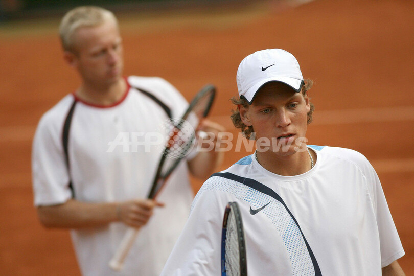 【デュッセルドルフ/ドイツ 25日 AFP】テニス、ARAGワールド・チーム・カップ(Arag World Team Cup)、レッド・グループ、ドイツvsチェコ。ドイツのフィリップ・コールシュライバー(Philipp Kohlschreiber)/アレクサンダー・バスケ(Alexander Waske)組は、第3戦でチェコのトマス・ベルディハ(Tomas Berdych)/レオシュ・フリエドル(Leos Friedl、左)組と対戦し、コールシュライバー/バスケ組がセットカウント2-1(6-4、6(2)-7、10-5)で勝利した。試合はドイツが2-1でチェコを破り、対戦成績を3勝0敗とし決勝進出を決めた。(c)AFP/PATRIK STOLLARZ