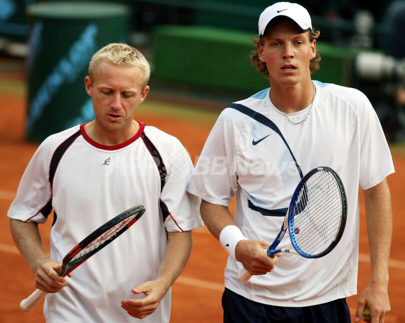 【デュッセルドルフ/ドイツ 25日 AFP】テニス、ARAGワールド・チーム・カップ(Arag World Team Cup)、レッド・グループ、ドイツvsチェコ。ドイツのフィリップ・コールシュライバー(Philipp Kohlschreiber)/アレクサンダー・バスケ(Alexander Waske)組は、第3戦でチェコのトマス・ベルディハ(Tomas Berdych)/レオシュ・フリエドル(Leos Friedl、左)組と対戦し、コールシュライバー/バスケ組がセットカウント2-1(6-4、6(2)-7、10-5)で勝利した。試合はドイツが2-1でチェコを破り、対戦成績を3勝0敗とし決勝進出を決めた。(c)AFP/PATRIK STOLLARZ