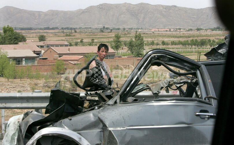 【河北省/中国 27日 AFP】当局の記録によると、中国の道路では年間10万人以上(1日当り平均270人)が死亡しており、世界で最も危険な道路の一つとなっている。写真は23日、北部の河北省(Hebei province)で、北京=張家口(Zhangjiakou)高速道路上の事故車を見る農夫。(c)AFP/Frederic J. BROWN