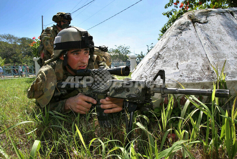 【ディリ/東ティモール 27日 AFP】東ティモール国防軍は26日、国防軍と反乱兵の衝突を停止させ、首都ディリ(Dili)の秩序回復を行うため、オーストラリア軍に治安活動を引き渡した。ジョゼ・ラモス・ホルタ(Jose Ramos-Horta)外相によると、民家への放火や市民への銃撃などから、少なくとも15人が死亡した事態から1日が経ち、政府軍兵士には兵舎に戻るよう指示が出ている。写真は26日、ディリの安全を確保する豪軍兵士たち。(c)AFP/Jewel SAMAD