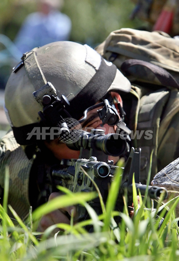 【ディリ/東ティモール 27日 AFP】東ティモール国防軍は26日、国防軍と反乱兵の衝突を停止させ、首都ディリ(Dili)の秩序回復を行うため、オーストラリア軍に治安活動を引き渡した。ジョゼ・ラモス・ホルタ(Jose Ramos-Horta)外相によると、民家への放火や市民への銃撃などから、少なくとも15人が死亡した事態から1日が経ち、政府軍兵士には兵舎に戻るよう指示が出ている。写真は26日、ディリの安全を確保する豪軍兵士たち。(c)AFP/Jewel SAMAD