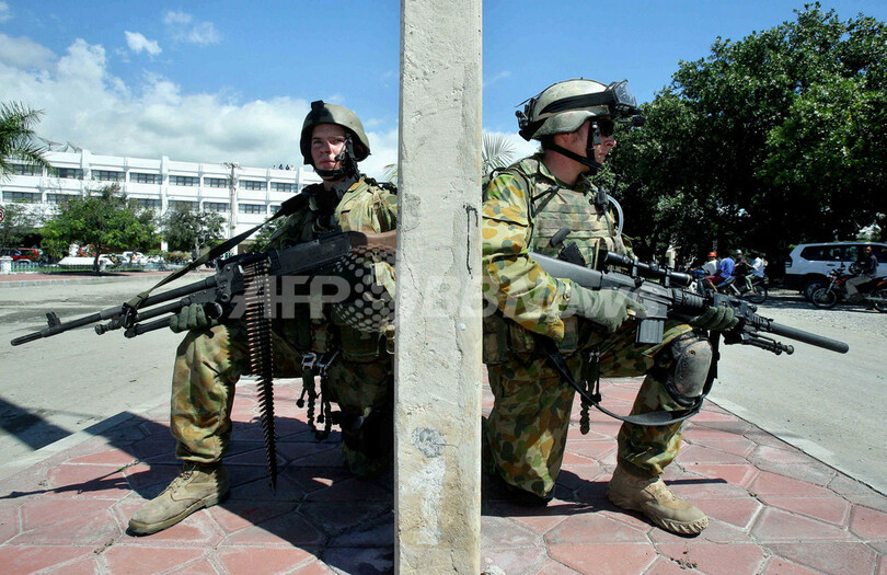 【ディリ/東ティモール 27日 AFP】東ティモール国防軍は26日、国防軍と反乱兵の衝突を停止させ、首都ディリ(Dili)の秩序回復を行うため、オーストラリア軍に治安活動を引き渡した。ジョゼ・ラモス・ホルタ(Jose Ramos-Horta)外相によると、民家への放火や市民への銃撃などから、少なくとも15人が死亡した事態から1日が経ち、政府軍兵士には兵舎に戻るよう指示が出ている。写真は26日、ディリの安全を確保する豪軍兵士たち。(c)AFP/Jewel SAMAD