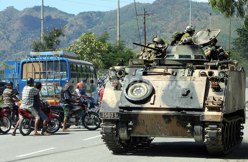 【ディリ/東ティモール 27日 AFP】東ティモール国防軍は26日、国防軍と反乱兵の衝突を停止させ、首都ディリ(Dili)の秩序回復を行うため、オーストラリア軍に治安活動を引き渡した。ジョゼ・ラモス・ホルタ(Jose Ramos-Horta)外相によると、民家への放火や市民への銃撃などから、少なくとも15人が死亡した事態から1日が経ち、政府軍兵士には兵舎に戻るよう指示が出ている。写真は26日、ディリの安全を確保する豪軍兵士たち。(c)AFP/Jewel SAMAD