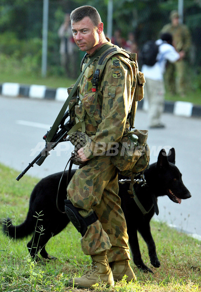 【ディリ/東ティモール 27日 AFP】東ティモール国防軍は26日、国防軍と反乱兵の衝突を停止させ、首都ディリ(Dili)の秩序回復を行うため、オーストラリア軍に治安活動を引き渡した。ジョゼ・ラモス・ホルタ(Jose Ramos-Horta)外相によると、民家への放火や市民への銃撃などから、少なくとも15人が死亡した事態から1日が経ち、政府軍兵士には兵舎に戻るよう指示が出ている。写真は26日、ディリの安全を確保する豪軍兵士たち。(c)AFP/Jewel SAMAD