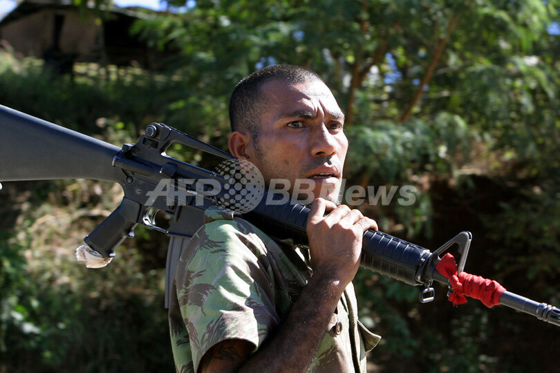 【ディリ/東ティモール 27日 AFP】ディリ(Dili)では26日、政府軍と反乱兵士との銃撃戦を止めるため、オーストラリア軍が治安確保にあたり、緊張した静けさに包まれている。家への放火や武装していない人が撃たれるなど、少なくとも15人が死亡した事態から1日が経ち、ジョゼ・ラモス・ホルタ(Jose Ramos-Horta)外相によると、政府軍兵士は兵舎に戻るよう指示されている。写真は26日、ディリ郊外のベコラ(Becora)に近い山間部で、反乱軍と思われる部隊との銃撃戦へ向かう途中、空砲を放つ東ティモール政府軍の兵士。(c)AFP/Jewel SAMAD