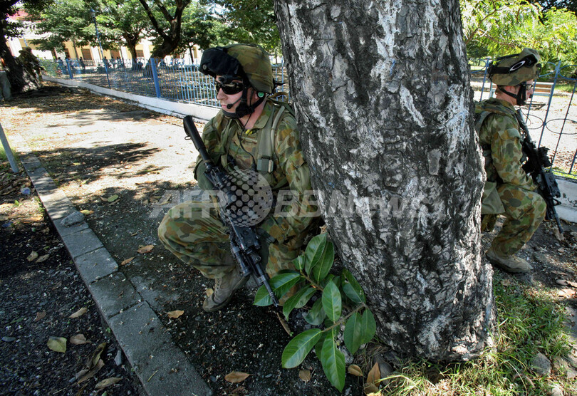 【ディリ/東ティモール 27日 AFP】ディリ(Dili)では26日、政府軍と反乱兵士との銃撃戦を止めるため、オーストラリア軍が治安確保にあたり、緊張した静けさに包まれている。家への放火や武装していない人が撃たれるなど、少なくとも15人が死亡した事態から1日が経ち、ジョゼ・ラモス・ホルタ(Jose Ramos-Horta)外相によると、政府軍兵士は兵舎に戻るよう指示されている。写真は、26日ディリをパトロール中、地面に伏せるオーストラリア兵士。(c)AFP/Jewel SAMAD