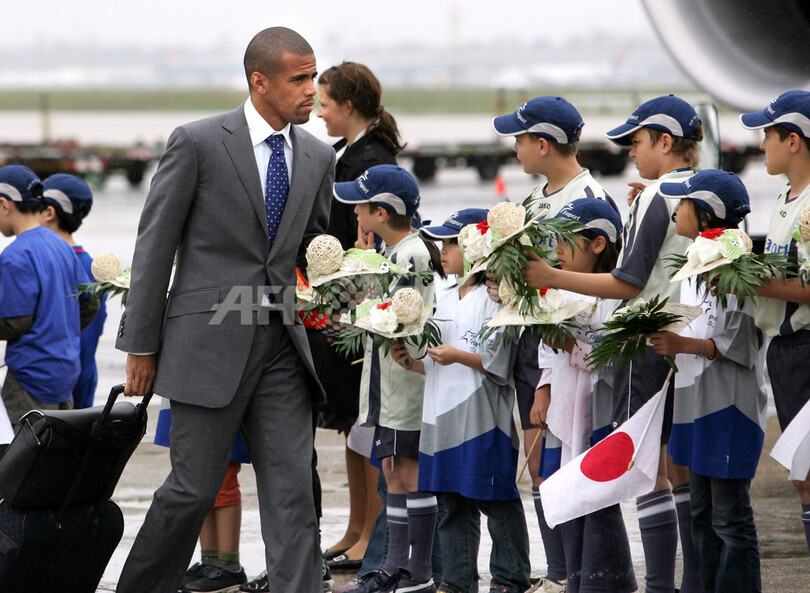 【フランクフルト/ドイツ 26日 AFP】6月9日から開幕する06サッカーW杯に出場する日本代表は、26日に開催地ドイツのフランクフルト国際空港に到着した。この後、日本代表は大会期間中のキャンプ地となるボンへ移動する。3大会連続3度目の出場となる日本代表は5月30日にドイツと6月4日にはマルタと親善試合を行い本大会に臨む。写真は、フランクフルト国際空港でファンの歓迎を受ける中田英寿(Hidetoshi Nakata)。(c)AFP/TOSHIFUMI KITAMURA