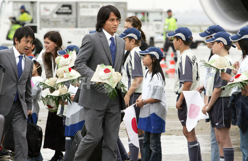 【フランクフルト/ドイツ 26日 AFP】6月9日から開幕する06サッカーW杯に出場する日本代表は、26日に開催地ドイツのフランクフルト国際空港に到着した。この後、日本代表は大会期間中のキャンプ地となるボンへ移動する。3大会連続3度目の出場となる日本代表は5月30日にドイツと6月4日にはマルタと親善試合を行い本大会に臨む。写真は、フランクフルト国際空港でファンの歓迎を受ける中田英寿(Hidetoshi Nakata)。(c)AFP/TOSHIFUMI KITAMURA